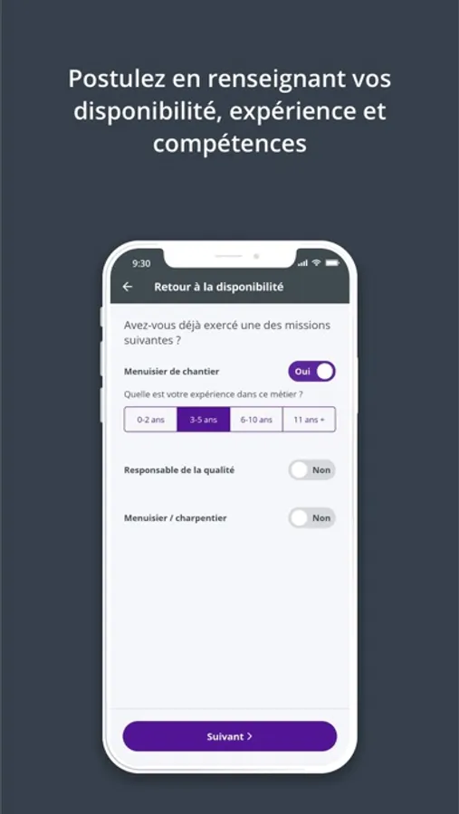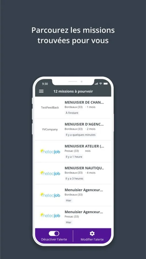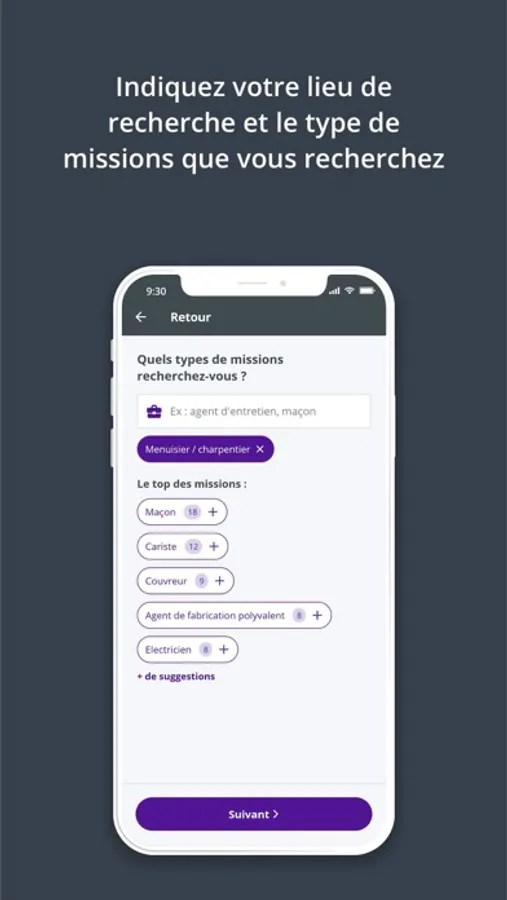 indiquez simplement votre lieu de recherche et le type de missions que vous recherchez. L’application