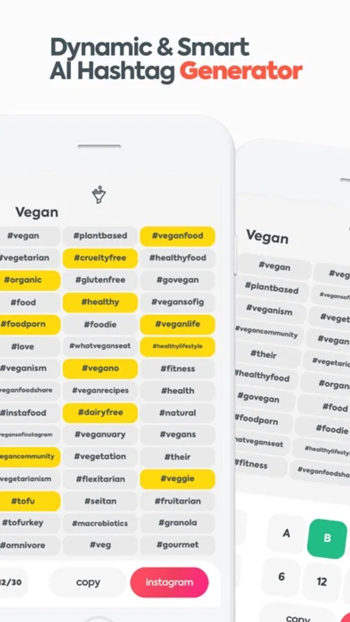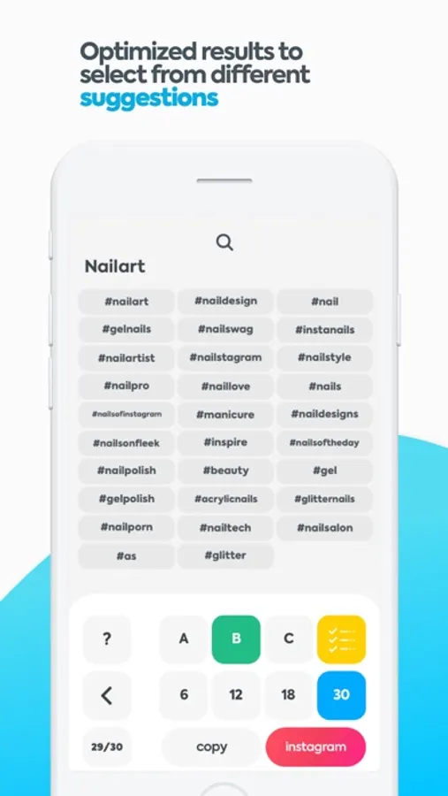 2-Choose hashtags from 3 suggestions, filter how many hashtags will be copied or create your own with selecting individually.