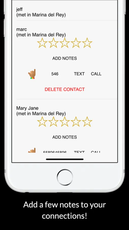 - Contact Sorting by date, location, interaction rating (1-5 stars), A-Z
