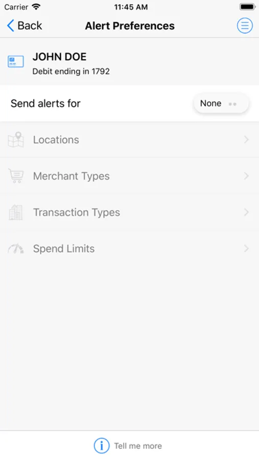Set spending limits to decline transactions above your thresholds. Monitor activity by category such as gas stations and restaurants, and by type: in-store purchases, e-commerce transactions and ATM transactions.