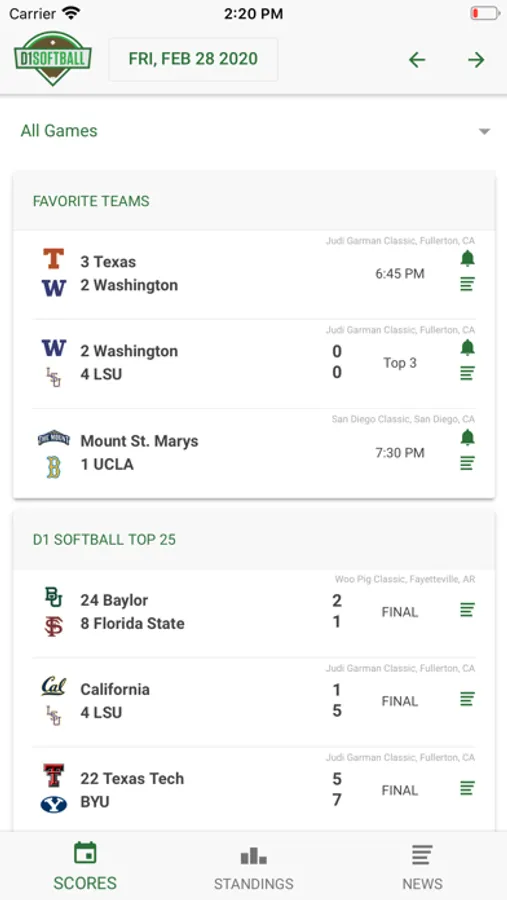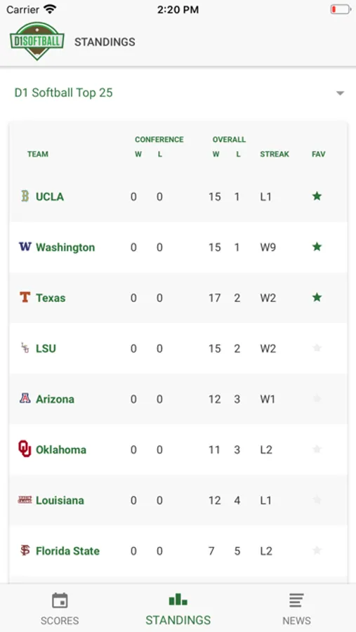 This subscription enables use of the D1 Softball app which provides up-to-date scores, standings, and schedules for Division I College Baseball. Once subscribed, you will be able to view information about your favorite Division I College Baseball teams. While viewing team standings, by conference, you can select teams as favorites. Games for your favorite teams will show up first in the scores view. You can also receive alerts, in the form of push notifications, for selected teams.