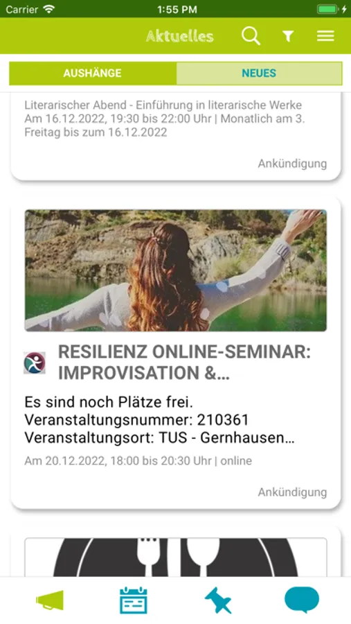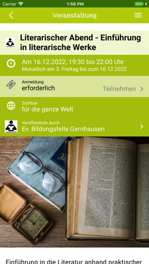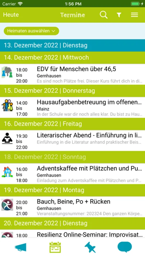 Sie hilft dabei, gemeinsame Projekte und Veranstaltungen zu organisieren, diese unter „Aushänge“ im kleinen oder großen Kreis anzukündigen und im Kalender einzutragen. Die Angebote in der App sind eine Fundgrube ganz unterschiedlicher Bildungsangebote, Veranstaltungen und Projekte, die zur einmaligen oder mehrmaligen Teilnahme und Mitarbeit einladen.