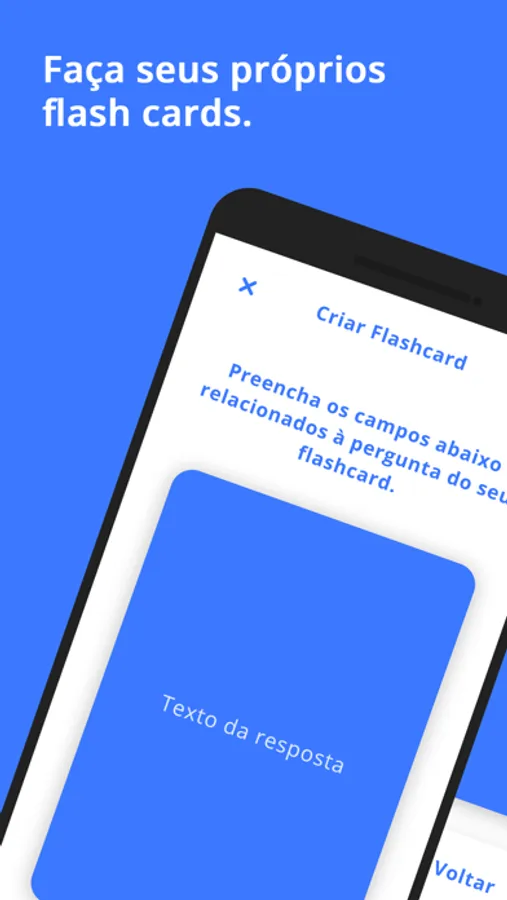 Nosso aplicativo conta com flash cards criados por nós e pela comunidade, também é possível você criar seus próprios flash cards para seus estudos.