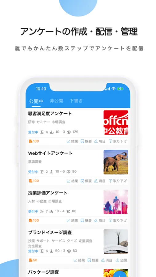 アプリ内では、オンラインアンケート情報の配信機能や応募機能を備えています。誰てもアンケート募集情報を配信できます。有償アンケートを配信したい場合は、先にポイントを購入してください。