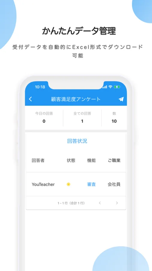 集まったアンケートをエクセルファイルに書き出すことができます。一覧画面の右上のボタンを押して、エクセルに書き出し、パソコンなどへ共有してお使いください。