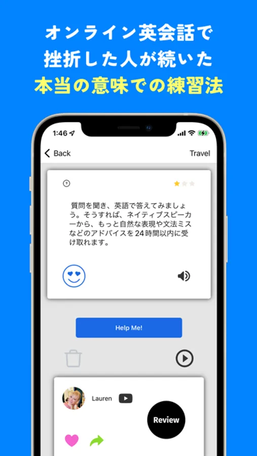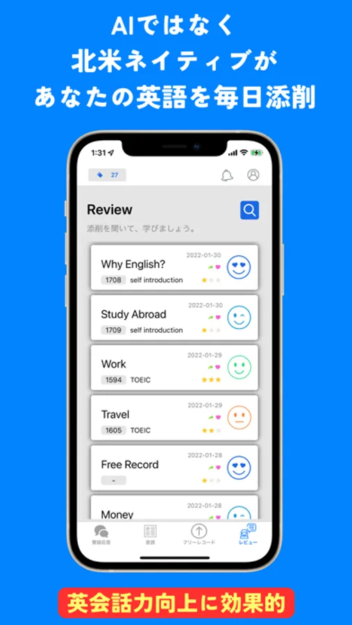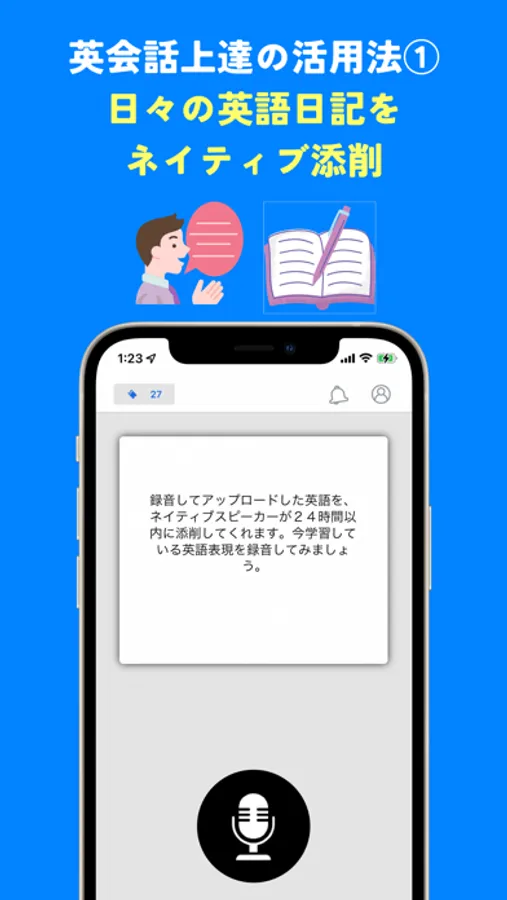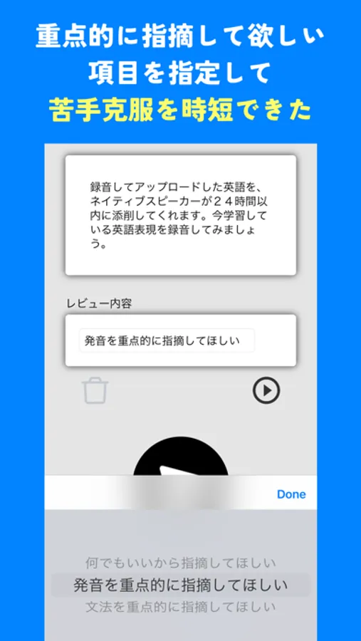 あなたの英語をアプリに録音すると、北米ネイティブスピーカーが文法ミス、発音ミスだけでなく、自然な言い回しを音声でフィードバックしてくれます。