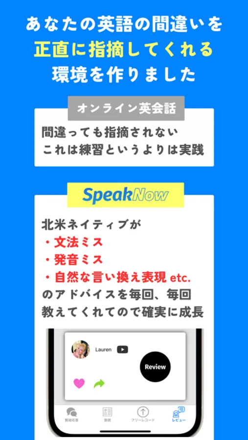 北米ネイティブが、文法ミス、発音のコツだけでなく、自然な表現まで教えてくれます。