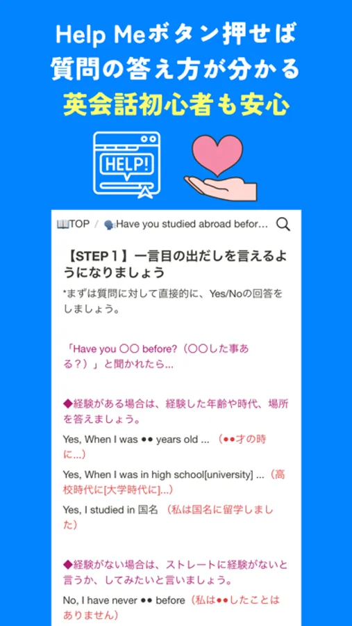 問題内にある「Help Me」ボタンを押せば、最初の一言目の例文や、そこからどうやって長いフレーズを喋るかなどが解説されたスピーキングディクショナリーの記事が開きます。