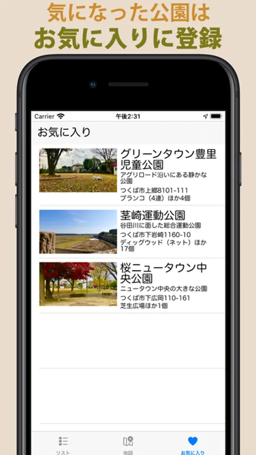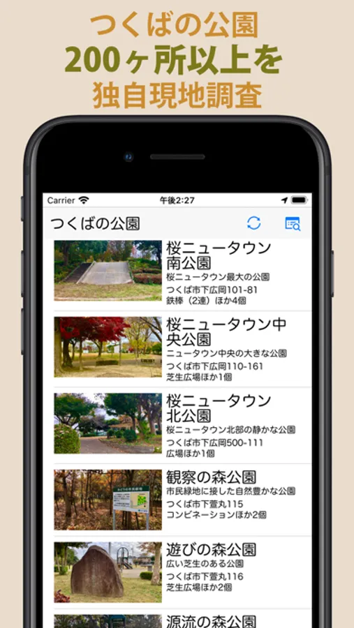 ・ 230を超えるつくば市の公園をリスト表示可能です。