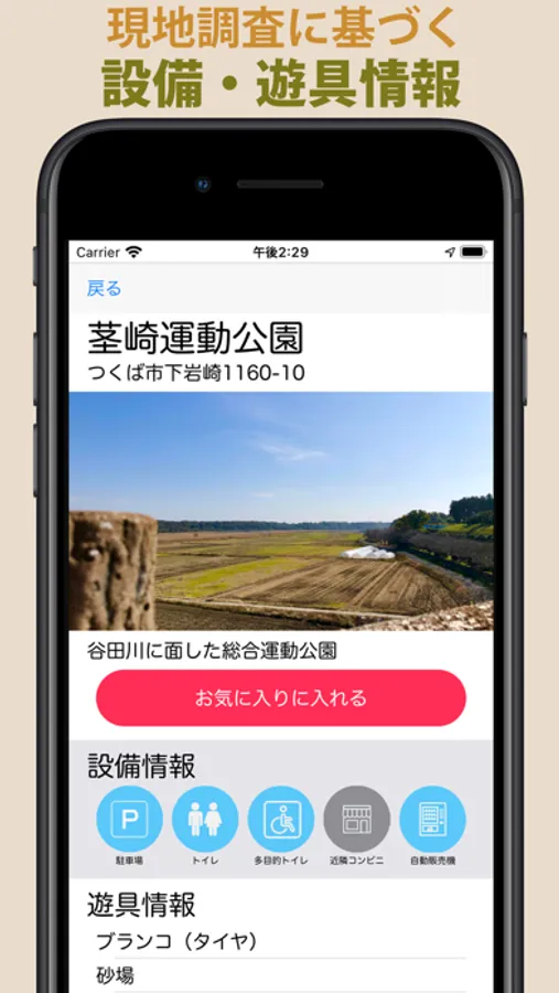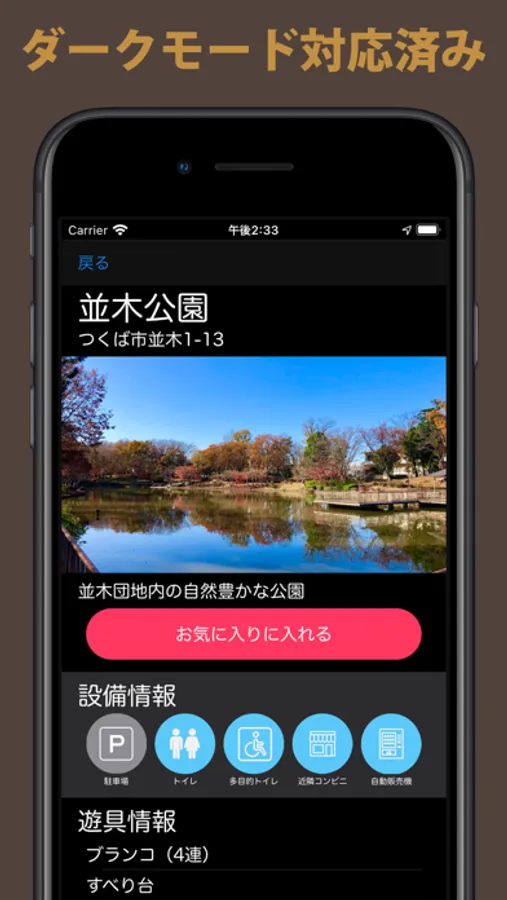 ・ 一覧表示された公園名をタップすることで、詳細な情報を表示することが可能です。