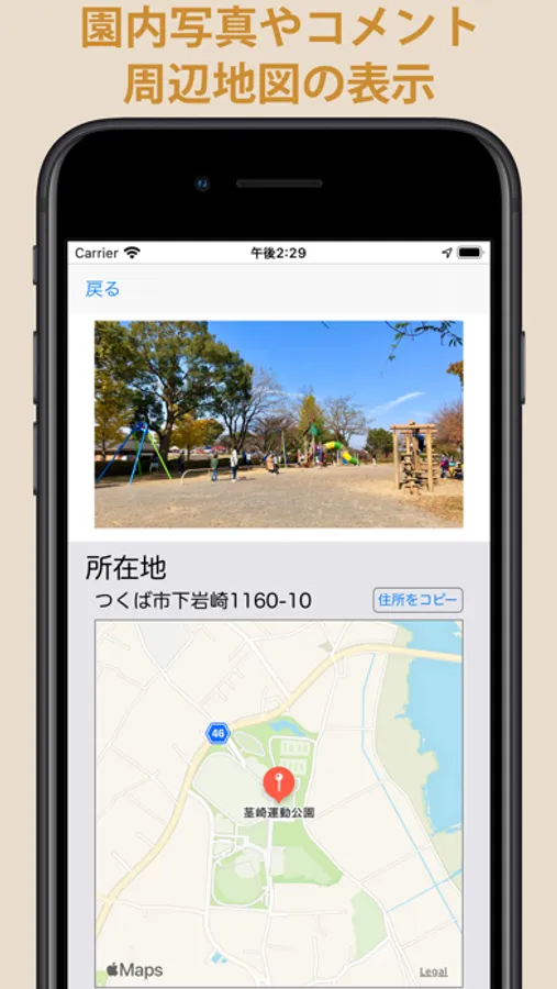 ・ 公園情報の確認、およびApple地図の表示、ならびに経路検索にはデータ(パケット)通信が伴います。アプリケーションは無料ですが、これらデータ通信に伴う費用はご利用者様のご負担となりますので、あらかじめご了承ください。