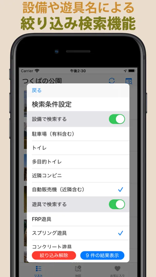 ・ 検索機能を併用することで、リストに表示する公園の数を絞ることが可能です。