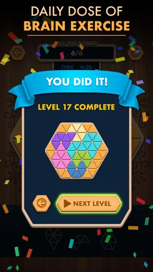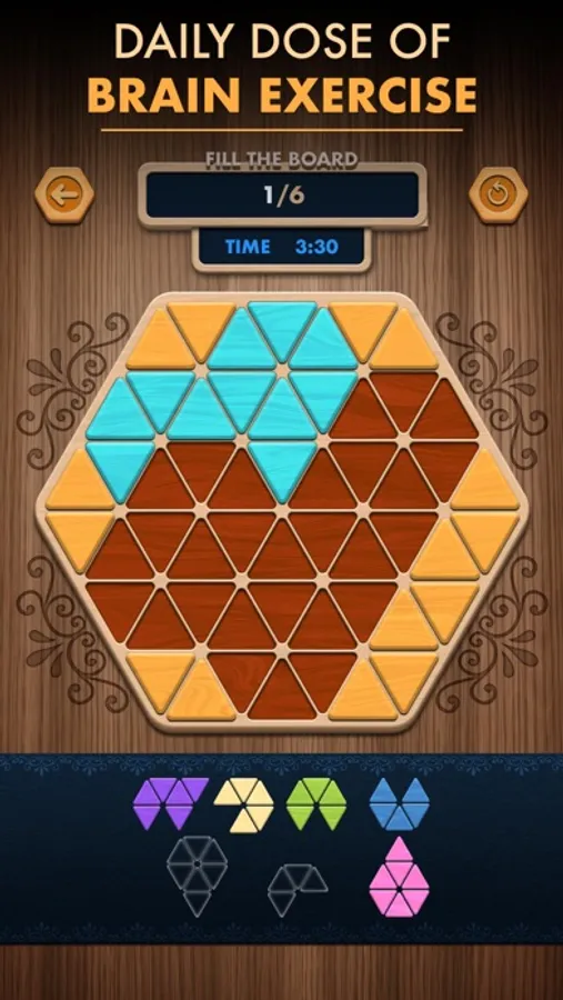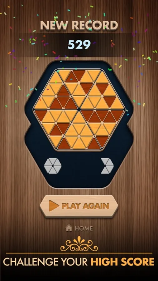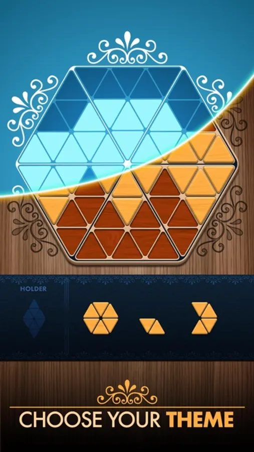 Woody Poly delivers a quality puzzle experience with its unique gameplay. No more usual square game board and normal shaped blocks, this brand-new game welcomes you to the world of triangular puzzle pieces and an impressive hexagonal board.