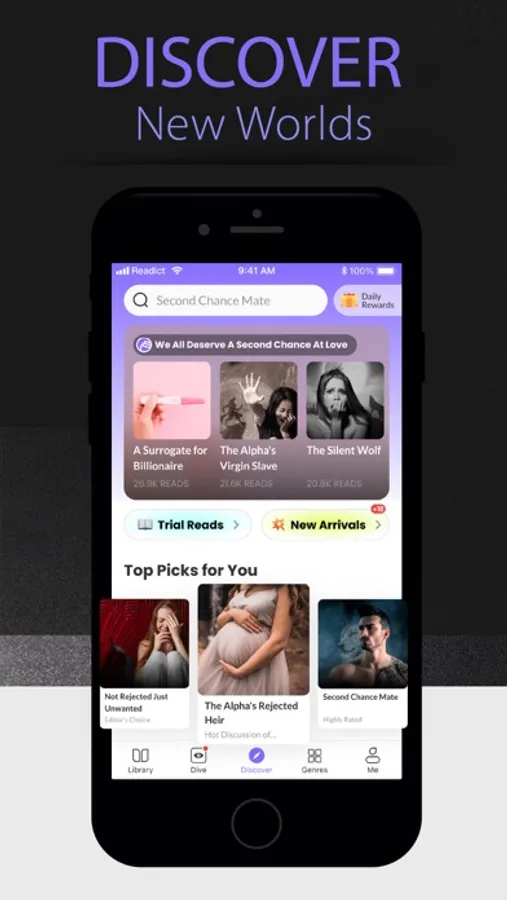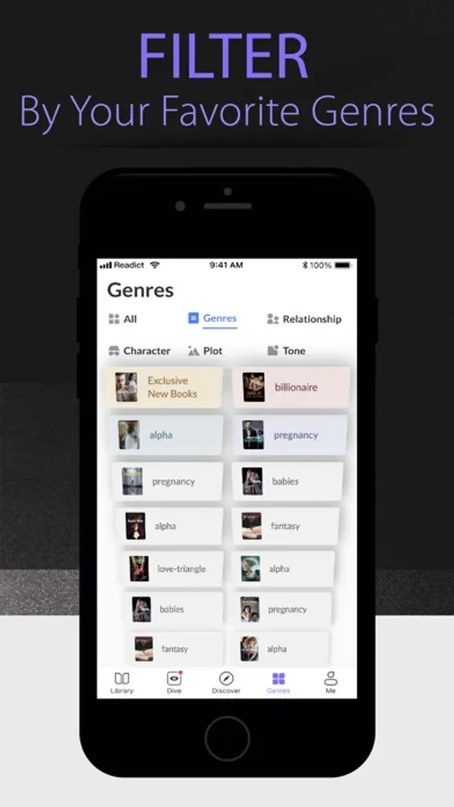 Readict has many in-app features to cater to your reading preferences. There's a variety of menus and pages to help you find your next book, such as Editor's Choice, Hot Genres, New and Trending, and Popular on Readict. And, in addition to saving your progress in a personal library, once you start reading, the app will suggest more stories based on the titles you've liked. Readict tailors your reading recommendations to your tastes so you can make the most of our large library of fantastic books. Read anytime and anywhere with Readict!