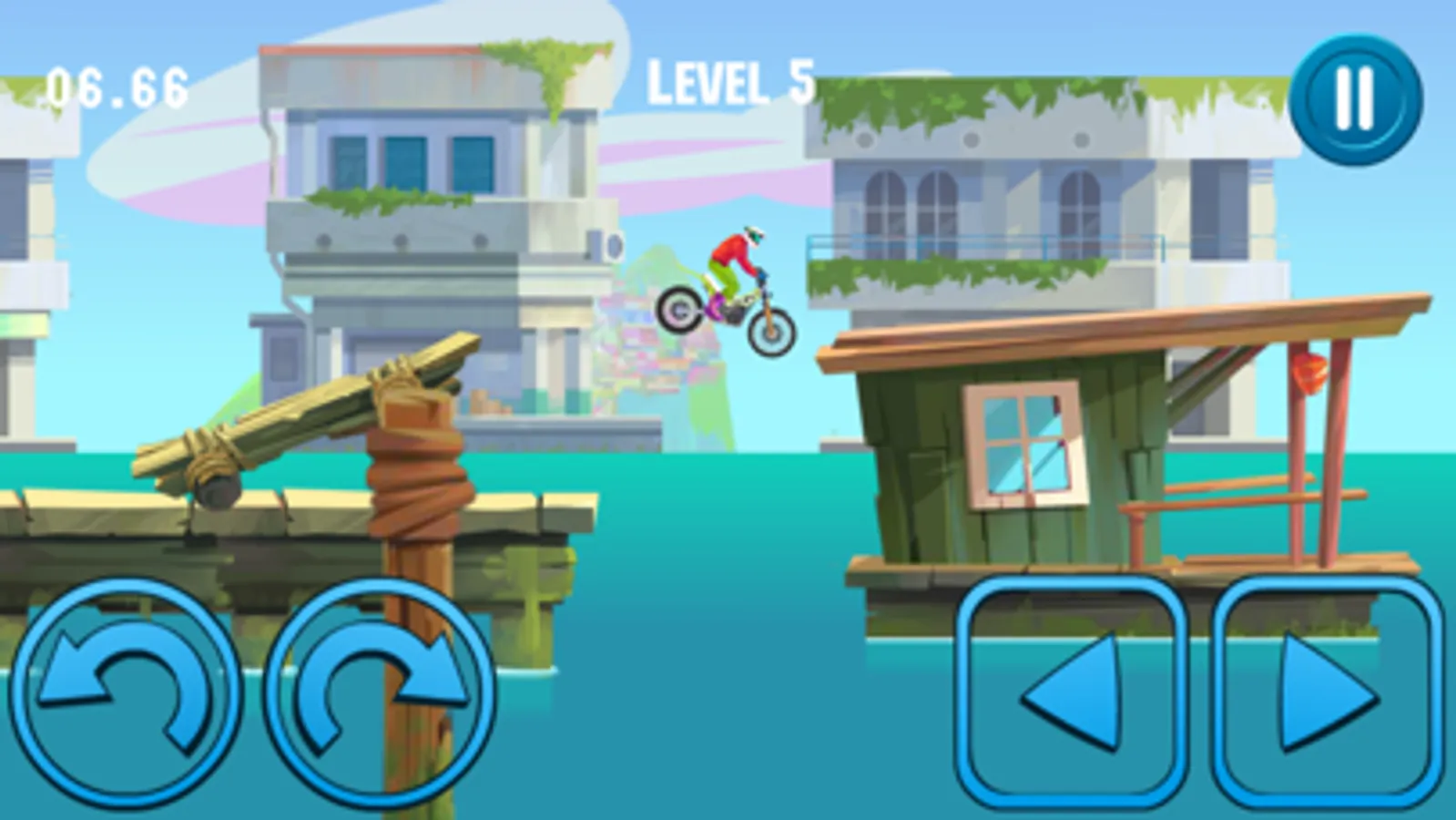 Overcome all the obstacles and don't let the biker hit head or flop. The balance is key - lean back or forward for the best grip.