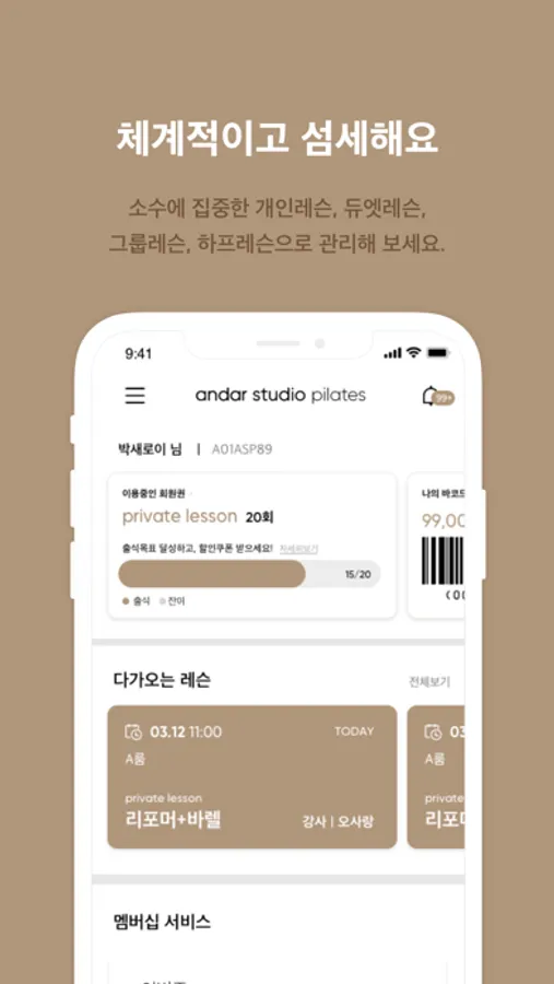 안다르 필라테스는 안다르 스튜디오 필라테스 회원님들을 위한 어플리케이션입니다.