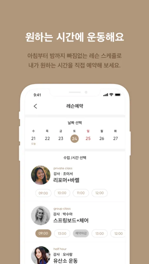 ● 레슨 예약: 2주 후 예약까지 앱에서 손쉽게 예약 / 대기하거나 취소하고, 출석을 확인할 수 있어요.
