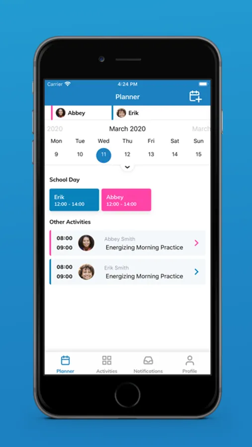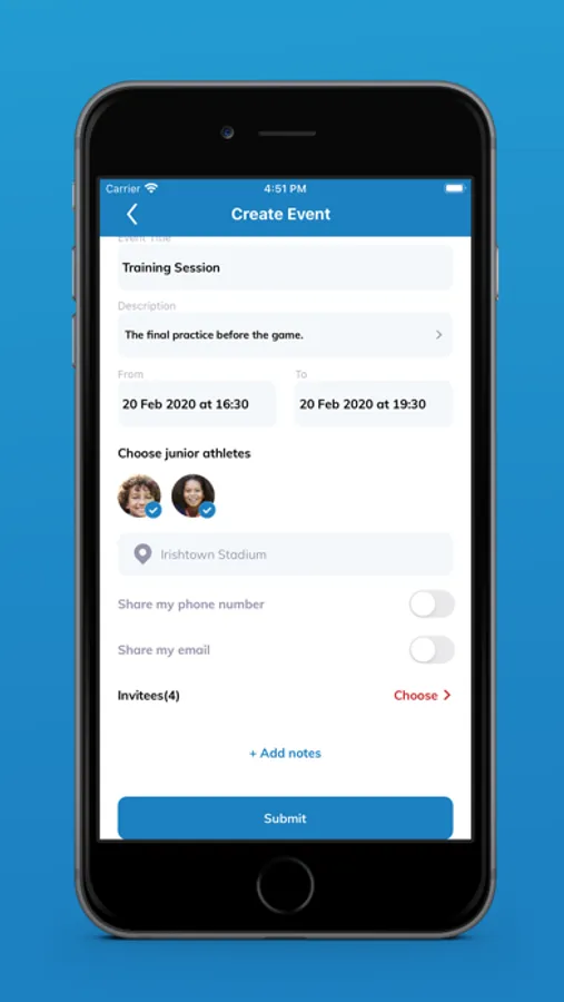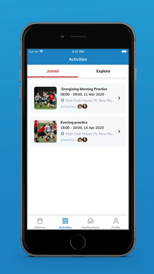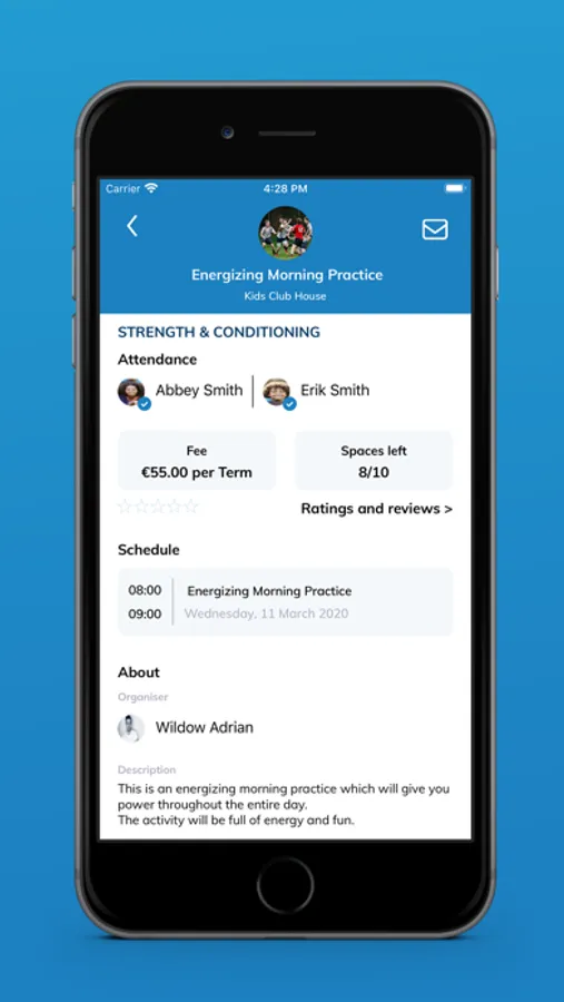 Through a web portal, sports organisations can dynamically create and maintain groups, services, events and daily schedules for its members. Its members access these live schedules and events through the mobile app.