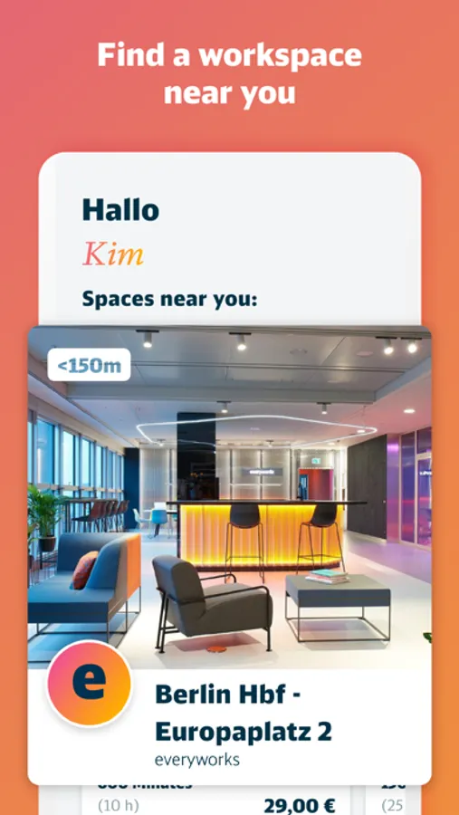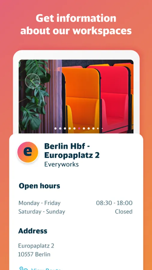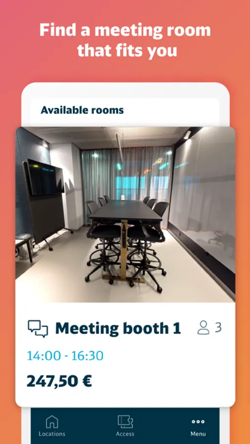 • Meeting Room: The most central meeting place in the city. Simply select the ideal meeting room via the app, book it and add participants. Receive the access pass to the meeting and use the app for convenient check-in/out.