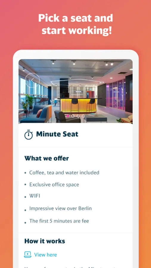 • Minute Seats: Your temporary professional workplace. Simply check in via the app, choose a seat and be productive. Billing is simple and to the minute after check-out.