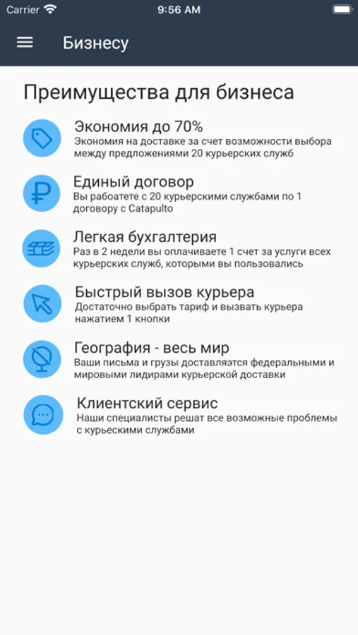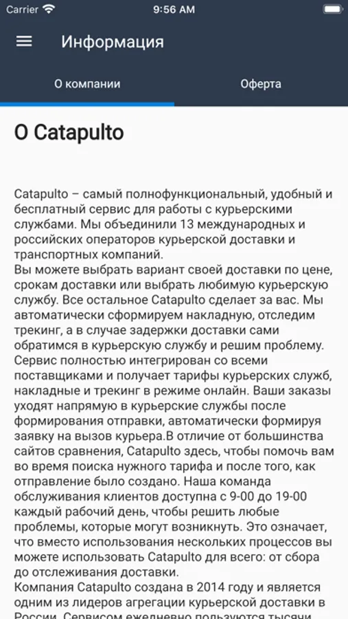 Catapulto – самый полнофункциональный, удобный и бесплатный сервис для работы с курьерскими службами. Мы объединили 13 международных и российских операторов курьерской доставки и транспортных компаний. Вы можете выбрать вариант своей доставки по цене, срокам доставки или выбрать любимую курьерскую службу. Все остальное Catapulto сделает за вас. Мы автоматически сформируем накладную, отследим трекинг, а в случае задержки доставки сами обратимся в курьерскую службу и решим проблему. Сервис полностью интегрирован со всеми поставщиками и получает тарифы курьерских служб, накладные и трекинг в режиме онлайн. Ваши заказы уходят напрямую в курьерские службы после формирования отправки, автоматически формируя заявку на вызов курьера. В отличие от большинства сайтов сравнения, Catapulto здесь, чтобы помочь вам во время поиска нужного тарифа и после того, как отправление было создано. Наша команда обслуживания клиентов доступна с 9-00 до 19-00 каждый рабочий день, чтобы решить любые проблемы, которые могут возникнуть. Это означает, что вместо использования нескольких процессов вы можете использовать Catapulto для всего: от сбора до отслеживания доставки. Компания Catapulto создана в 2014 году и является одним из лидеров агрегации курьерской доставки в России. Сервисом ежедневно пользуются тысячи корпоративных и частных клиентов, отправляя почту и грузы по России и всему миру.