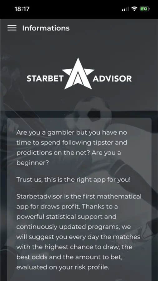 MathXBet è la prima app di profitto matematico sui pareggi. Grazie a un potente supporto statistico basato su valide basi scientifiche ed in continuo aggiornamento, ti suggeriremo ogni giorno le partite con un’alta probabilità di pareggio, le quote migliori e l’importo da giocare calcolato in base al tuo profilo di rischio.