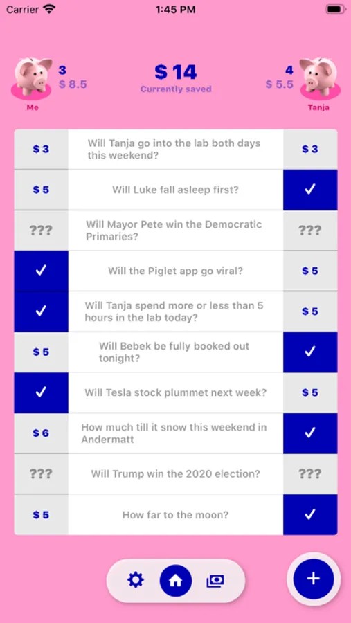 A fun app for couples to help keep track of bets that they make with one another. The loser pays some money into the piglet bank to be spent together on a rainy day.