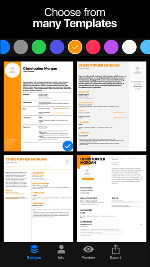 Your entire resume is at the top of your fingers. Every job you ever did can now be easily entered or edited, placed in a stylish or simple but effective template design of your choice.