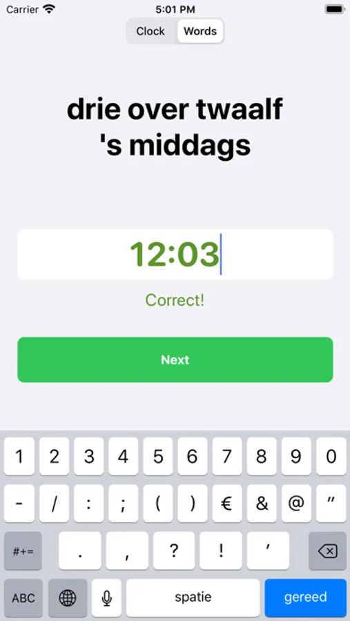 Learn to read the clock in Dutch by practicing entering clock times in Dutch. The app has two modi: