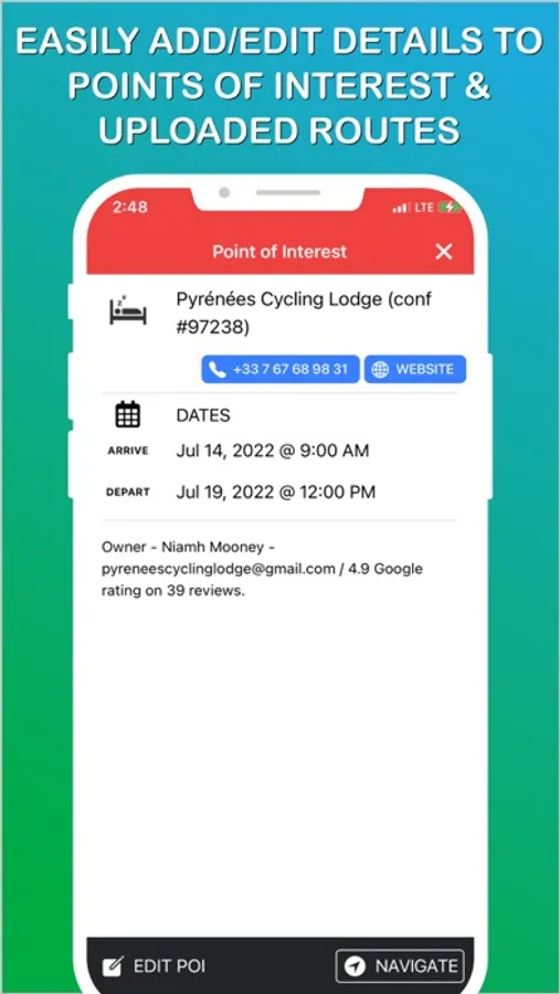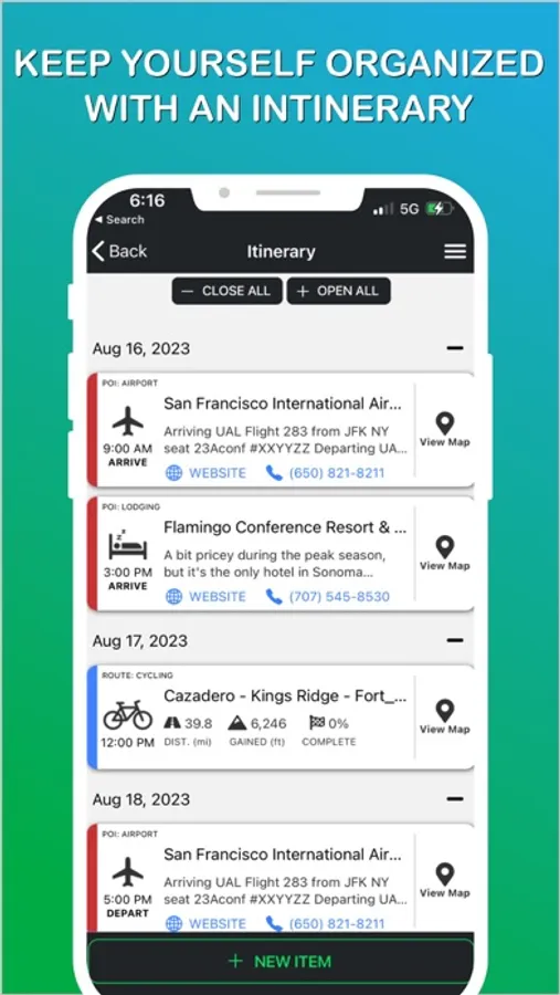 Search for all key locations and points of interest and load those onto your interactive map. Add every location that you will ever need to get to onto your Trip Interactive Map, and get to and from every point quickly and easily without ever having to leave your Interactive Map. Add all airports, rental car locations, hotels, restaurants, cycling and hiking routes, sports facilities, parking lots, beaches, bike shops, friends/family homes, parks, museums, historical locations, etc.