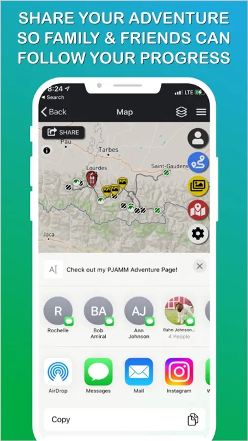 Invite others to follow you on their devices or desktops. Others will see where you are and how many of your objectives you have accomplished so far on your trip. Let others see how many miles you’ve travelled and feet you’ve climbed, in addition to where and how much you have left to do.