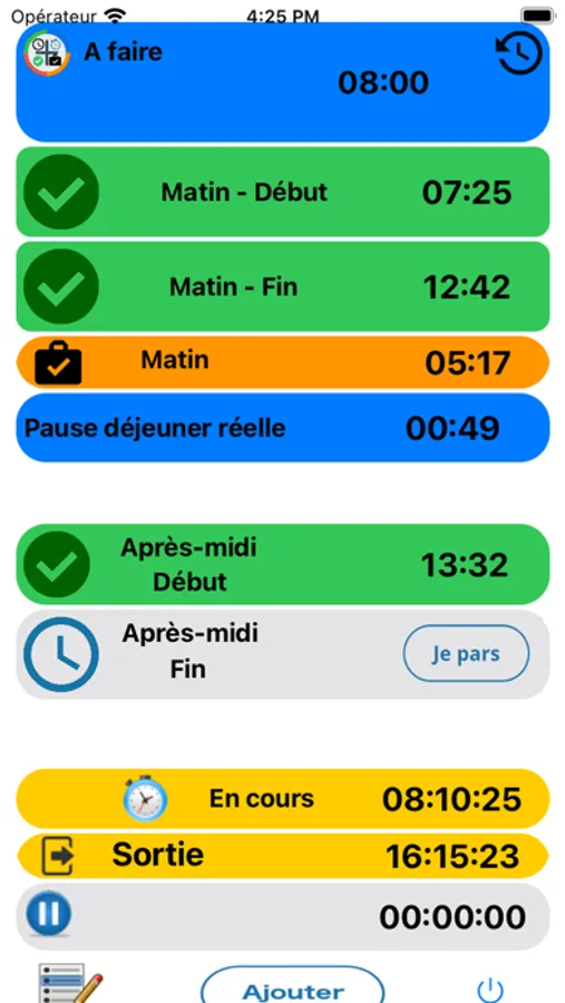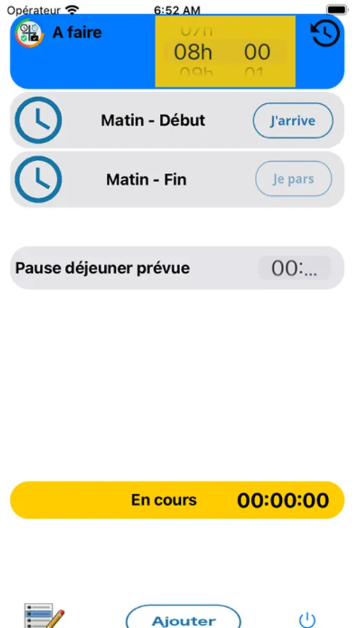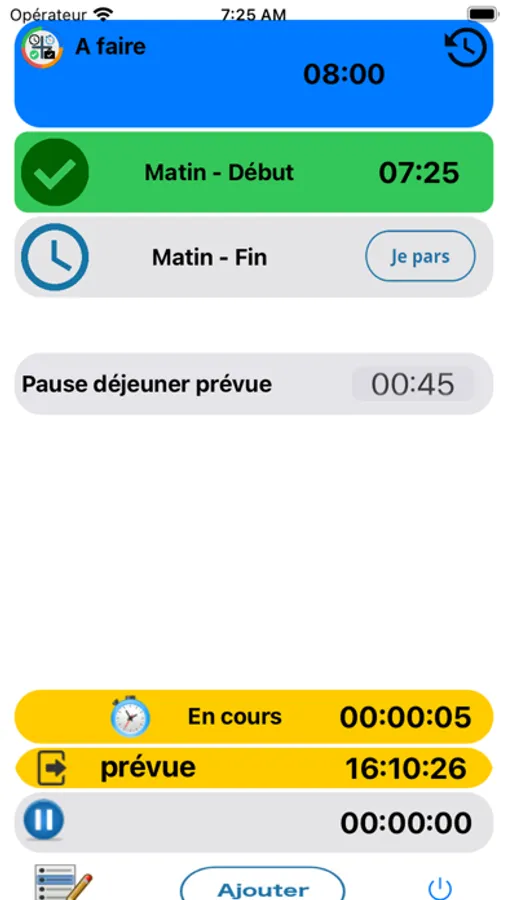 Elle vous indiquera l'heure de votre départ théorique dès que vous aurez déclenché le bouton "j'arrive" du matin. Cette heure de travail théorique est remise à jour au fur à mesure des pauses enregistrées et cumulées.