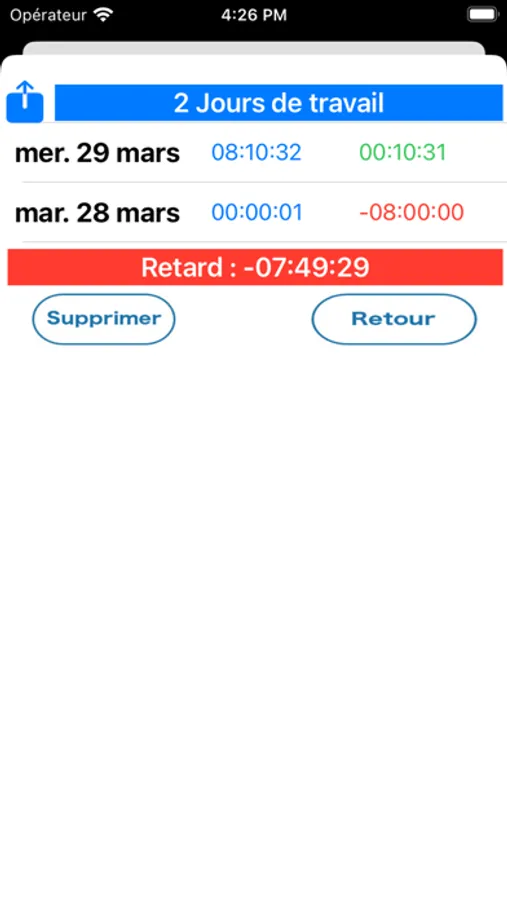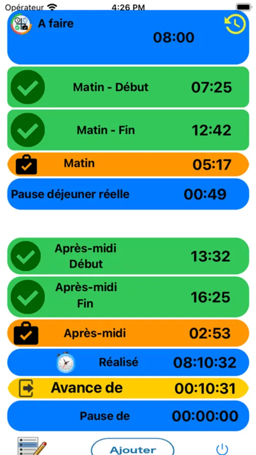Vos heures effectuées sont consultables avec un compteur d'avance et de retard de l'ensemble de vos journées. L'ajout d'autres journées est possible.