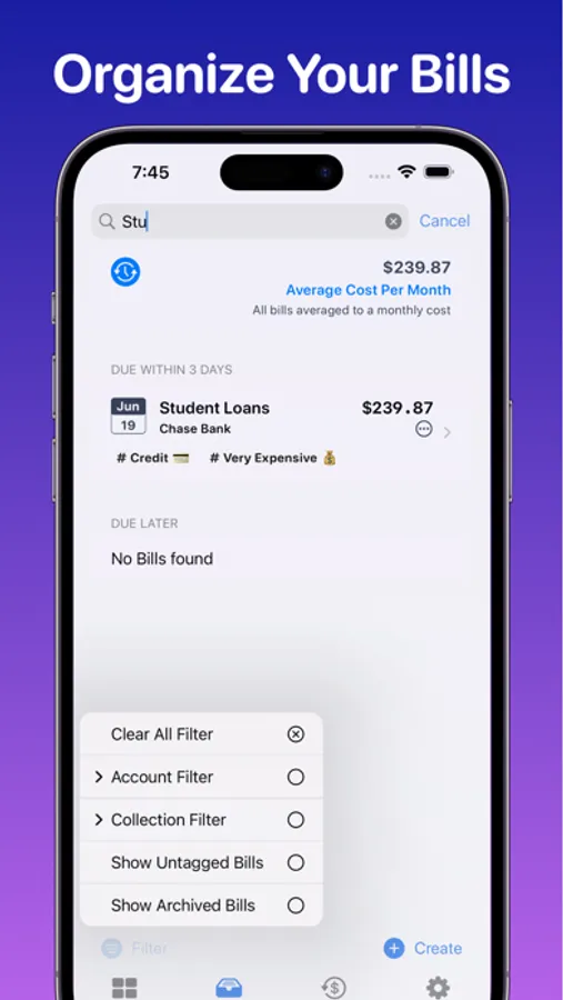 Organize your bills with tags and track where each bill charges by account. For example, Bills io can tell you how much money your credit card gets charged per month for all of your subscriptions. You can then plan to budget that cost every month with your bank account.