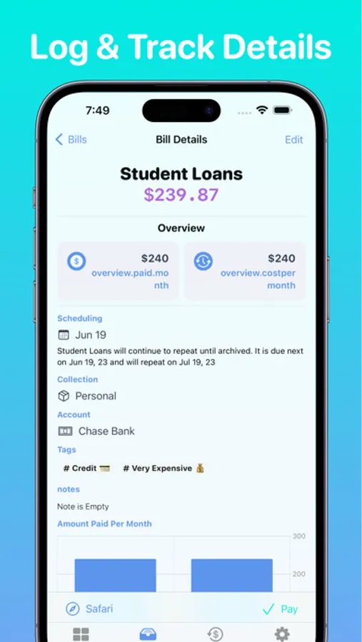 Bills io uses Apple's built in syncing via iCloud and your data stays with you in your iCloud account. There is no 3rd party looking into the Bills you add in the app. Everything is processed on device, and none of your data is sold to analytics companies. Bills io takes privacy as a first principle for all current and upcoming features.