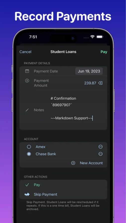 Track and record when you pay a Bill online. Bills io allows you to record any notes about a payment to recall later on. Notes support basic Markdown formatting to allow for links, formatting, and complex records. Export all of your payments to a CSV file for processing outside Bills io.