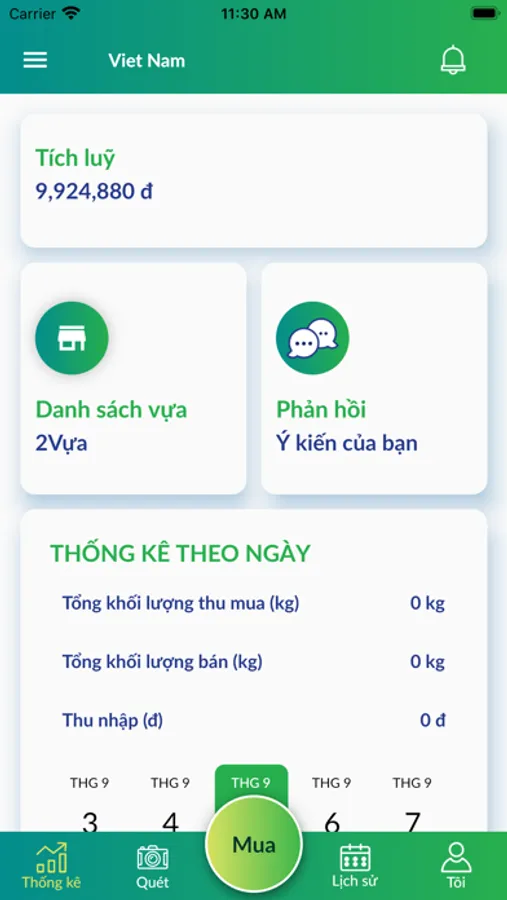 Thống kê chi tiết thu nhập và khối lượng mua bán phế liệu ngay trên ứng dụng.