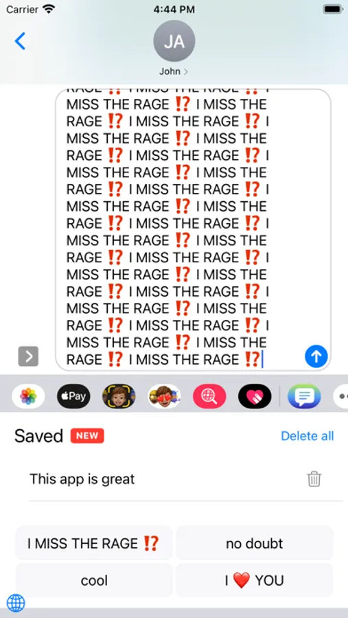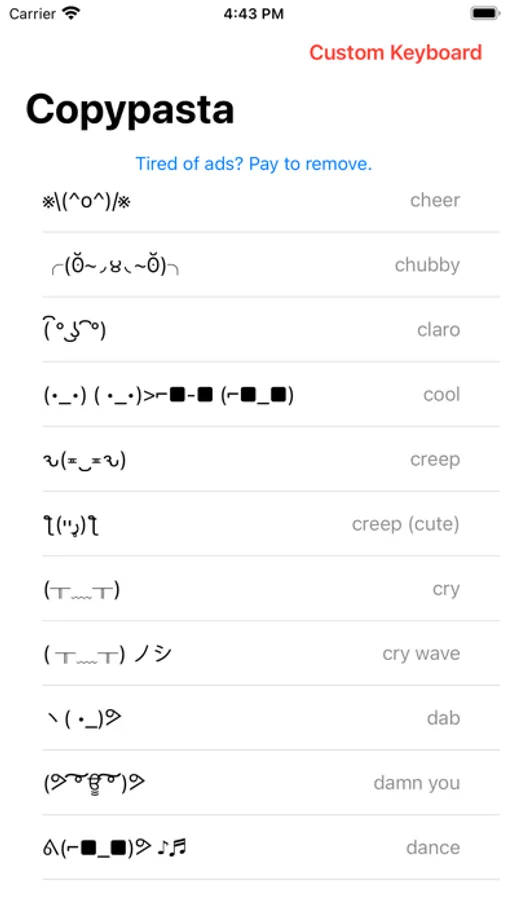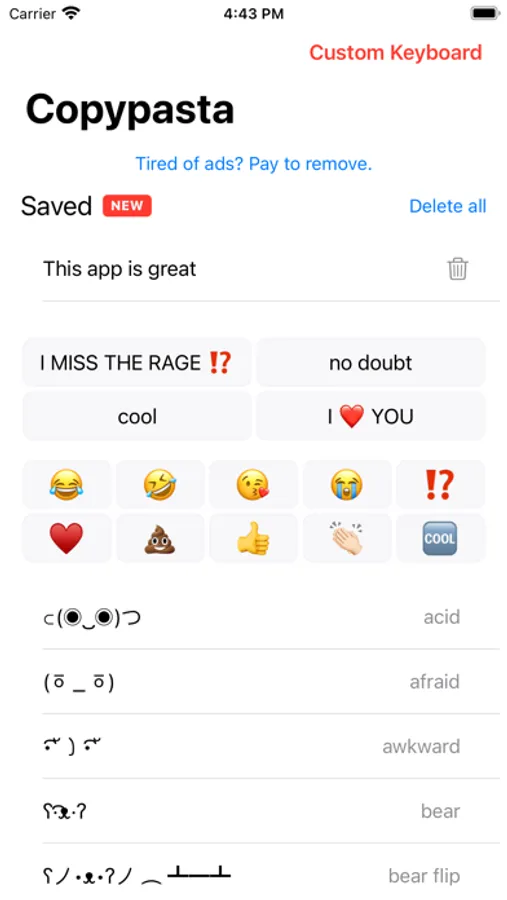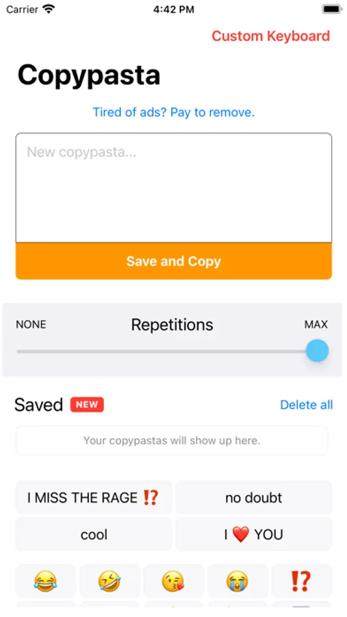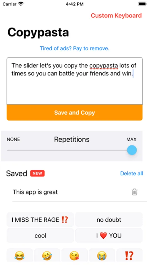 Copypasta Keyboard (formerly Dupe Message) is the best and only Copy & Paste app you need! Save your "copypastas" to quickly send them again in the future. Use the Repetition Dial to repeat your copypasta over and over! Use the custom keyboard to send your copypastas in any app. Best of all, use all of these features for free!