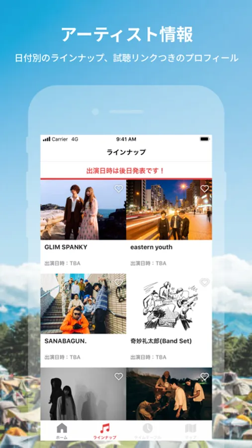 出演日別にタイムテーブルを確認できます。マイタイムテーブルの作成や、出演時間が近づくと通知をしてくれる"リマインダー機能"も。マイタイムテーブルはSNSなどでシェアすることも可能です。