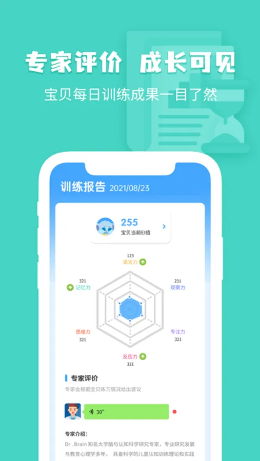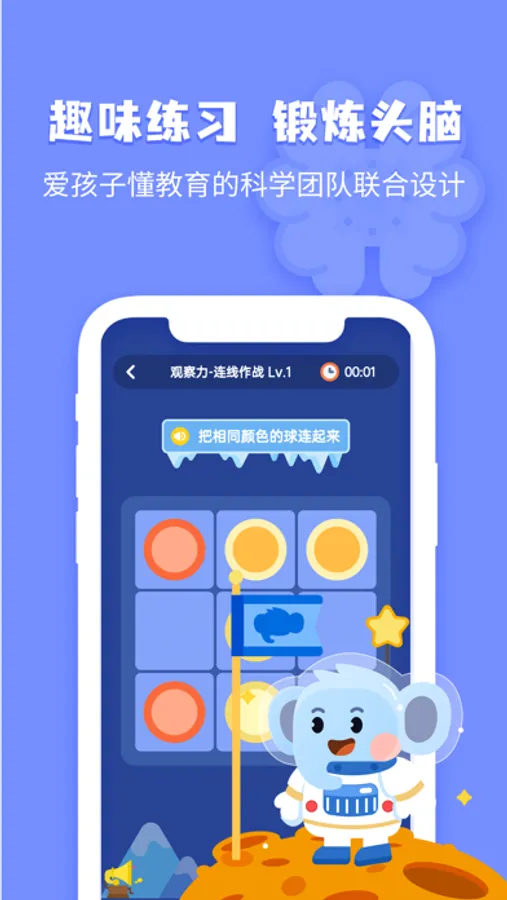 App内含众多脑力任务且持续更新,旨在为宝贝们提供兼具科学性与趣味性的训练内容,从而训练专注力、观察力、反应力、记忆力、创造力、逻辑力等多项脑力,帮助小朋友们在此黄金年龄段活跃大脑。