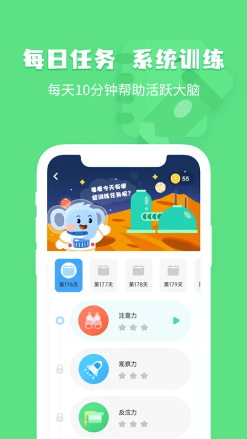 研究表明,宝贝在3-10岁是一生中大脑发育的黄金时期,80%的脑区能力在此时得到激活,脑力训练不容忽视!但不同年龄段的孩子脑区发展的侧重点不同,小象脑力贴合了3-10岁儿童脑力发展的规律体系,通过科学分龄、针对性分配训练项目,让不同年龄段的孩子在训练过程中轻松活跃大脑。