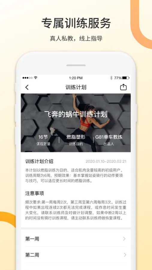 线上真人私教服务会针对每一个用户,为其制定专属的周期运动计划,及时跟踪用户运动状态及完成情况来调整计划,并提供科学饮食建议及指导,用户在家既可以体验真人私教的在线专属服务。