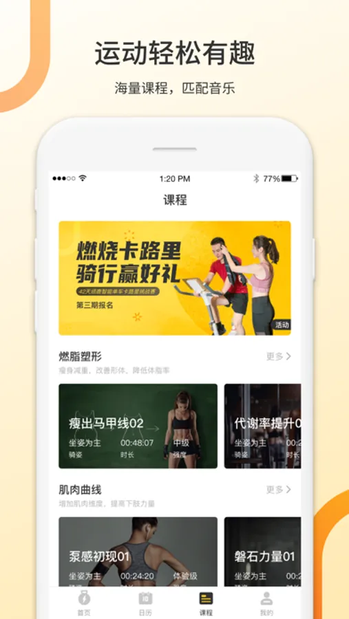 我们为您提供海量的动感单车课程,课程通过动感的音乐、智能语音教练指导、虚拟人物模拟等方式,让课程形式更激情丰富,即使在家运动也不再枯燥单调。
