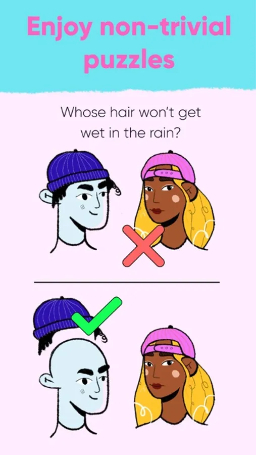 Can you think outside the box? Challenge your mind in an unordinary way and find absurd solutions to deceptively simple puzzles. Solving fun and tricky riddles and brain teasers is only possible if you’re being creative. Improve your logical thinking, memory and creativity and boost your brain power to become a real Brainkilla!