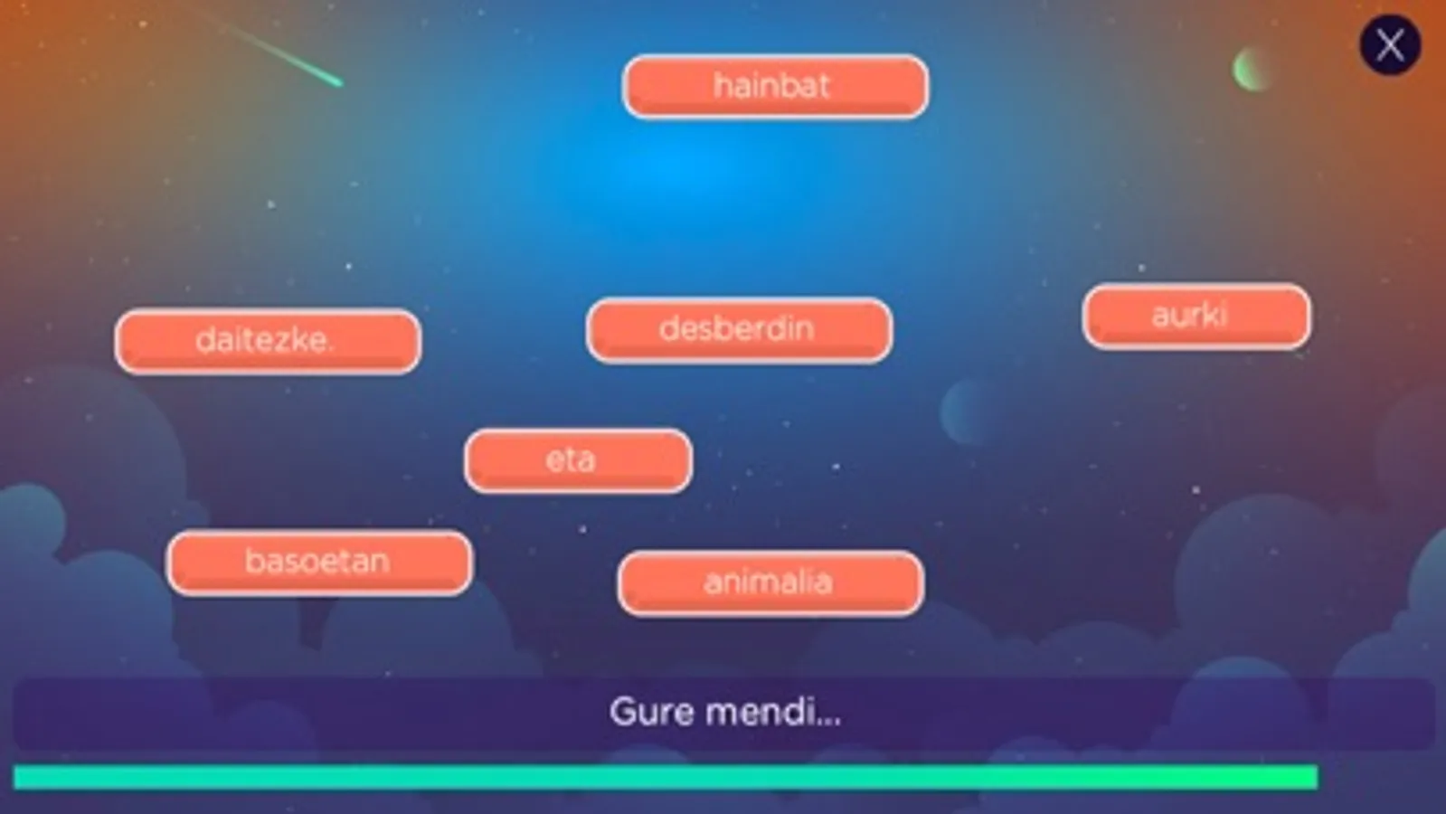 Kategoria ezberdinak aukeratu ditzakegu. Audio bat entzungo dugu esaldi batekin, ondoren esaldia osatzen duten hitzak ordenetik kanpo agertuko zaizkigu pantailan. Gure egitekoa, hitz horiek ordenean jartzea eta entzundako esaldia sortzea da. Denbora-zigorra jasoko dugu ez dagokion hitzak aukeratzen badugu, beraz adi ukitu beharko ditugu hitzak.