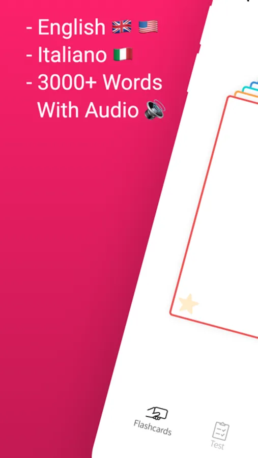 Expand your language skills with this app, the ultimate English-Italian vocabulary learning app. Unlock the power of 3000 commonly used words through an immersive learning experience designed to boost your language proficiency. Whether you're a beginner or an advanced learner, our app offers three dynamic features to accelerate your progress: Flashcards, Word Tests, and the exciting Match Game. Start your language journey today and become a fluent communicator in both English and Italian!"