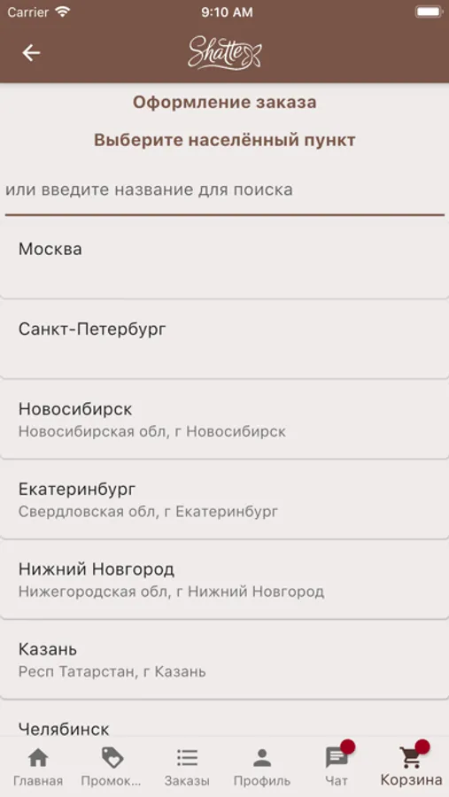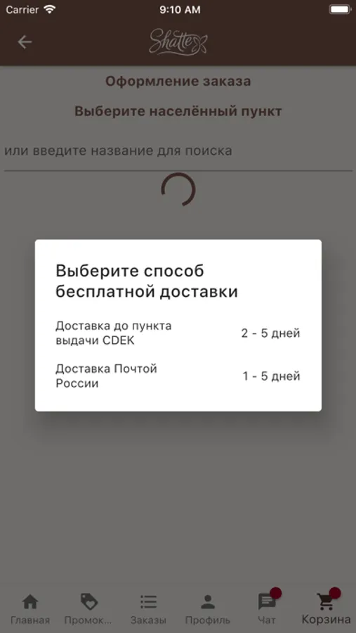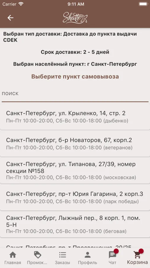 4. Если в Вашем городе нет магазинов Компании Shatte, делать онлайн-заказы товара с возможностью либо получить товар в удобном для Вас пункте выдачи транспортной компании CDEK, либо заказать доставку товара курьером Почты России на удобный для Вас адрес;