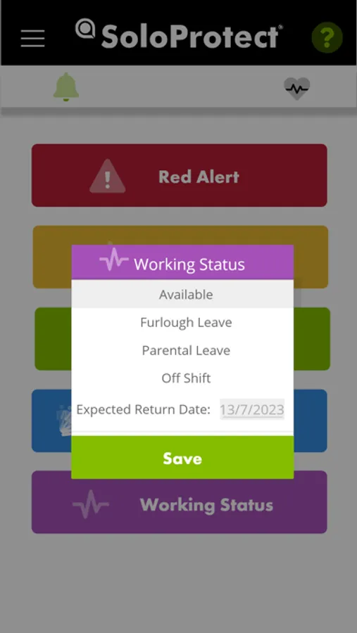 Allows you to indicate when you are or when you are not currently working. This is visible to your manager in SoloProtect Insights to assist the process of job allocation or the ongoing deployment of resources.