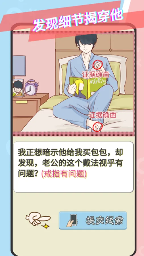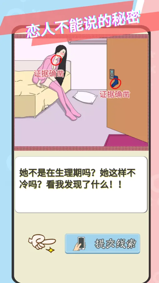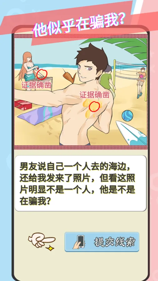 《爱情大侦探》是款讲述在我们生活中恋人之间的一些不可告的秘密,在这纷杂充满吸引的世界对于没对恋人来说都充满了大量诱惑(小三,出轨,暧昧...)各式各样的情景。感觉对于一顿清理能够一直甜蜜的生活到老好不容易.....。本游戏玩家扮演情侣的一方,根据阅读剧情从中找到对方不忠的线索,从图中找出花心那女的出轨证据。几十种出轨情景,简称一本恋爱宝典。当然也可能是误伤哦,如果对方真的经得起考验,那就且行且珍惜吧