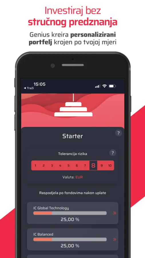 Nakon registracije ispunjavate upitnik procjene investitora. Genius algoritam precizno izračunava vašu individualnu toleranciju na rizik. Prema toj razini rizika Genius za vas kreira personalizirani investicijski portfelj, koji je odmah dostupan na pregled.